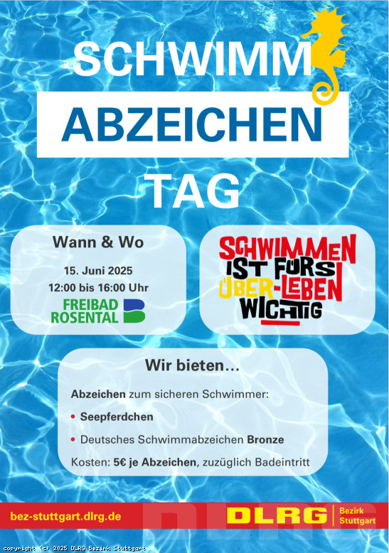 Schwimmabzeichentag im Freibad Vaihingen! Am 15. Juni 2025 von 12 bis 16 Uhr veranstalten wir in Kooperation mit den Stuttgarter Bädern den diesjährigen Schwimmabzeichentag im Freibad Vaihingen. Ob Seepferdchen oder Gold – Kinder, Jugendliche und Erwachsene haben die Möglichkeit, ihre Schwimmfähigkeiten unter Beweis zu stellen und ein offizielles Schwimmabzeichen zu erwerben. Kommt vorbei, macht mit und zeigt, was ihr könnt – es gelten die regulären Eintrittspreise. Wo: Freibad Vaihingen Wann: Sonntag, 15.06.2025 von 12 bis 16 Uhr ... Mehr erfahren