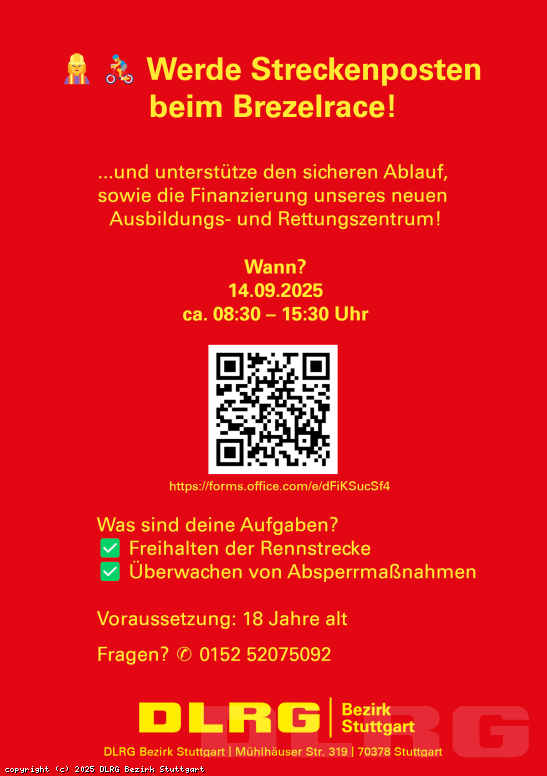 Wir brauchen deine Unterstützung! Am Sonntag, 14. September 2025, stellt die DLRG Stuttgart die Streckenposten beim Brezelrace – einem der größten Radrennen der Region. Das Besondere: Alle geleisteten Helferstunden werden als Spende gutgeschrieben und fließen direkt in unseren Vereinsneubau. Was du wissen musst: Mindestalter: 18 Jahre Keine DLRG-Mitgliedschaft erforderlich Einsatzkleidung ist nicht notwendig Wir können bis zu 200 Helferinnen und Helfer stellen – je mehr mitmachen, desto größer der Beitrag für unseren Verein! Ab dem 27.06.2025 starten wir regelmäßig mit Beiträgen auf WhatsApp und Instagram. Bitte aktiv teilen und weiterschicken – für eine starke Beteiligung. Jetzt anmelden: https://forms.office.com/e/dFiKSucSf4 Danke für deinen Ei ... Mehr erfahren