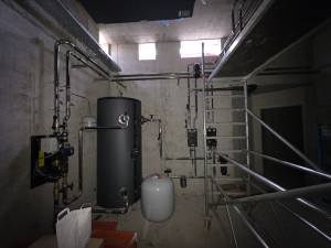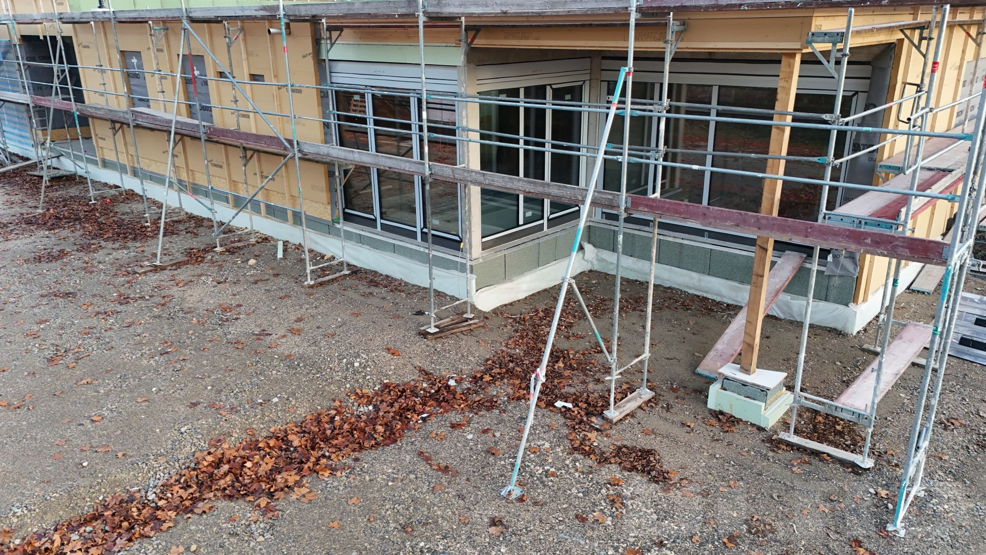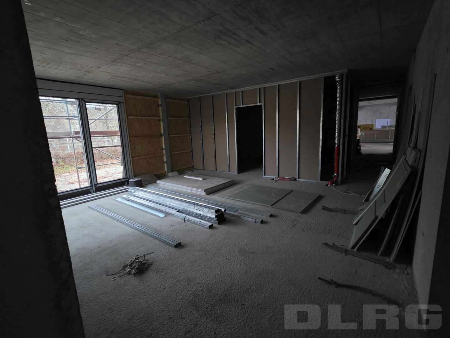 Parallel dazu arbeiten die Gewerke Heizung, Lüftung und Sanitär an den Anschlüssen für die sanitären Einrichtungen sowie an der Entlüftung. Seit Anfang Dezember werden zudem durch den Fensterbauer die Fensterrahmen samt Verglasung in die Außenwände eingebaut, wodurch das Gebäude zunehmend seine endgültige Gestalt annimmt.