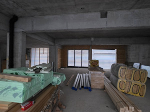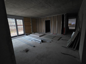 Im Holzbau werden derzeit die U-Profile für die Gipskartonwände montiert. Damit entstehen die letzten Raumtrennungen; in einigen Bereichen ist bereits die einseitige Beplankung angebracht.